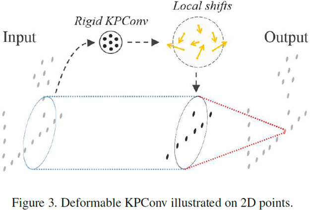 기존 2D 이미지에서 좋은 효과를 보였던 deformable convolution을 point cloud에도 적용하였습니다. 정해진 위치의 kernel point를 사용하는 대신 kernel point의 위치를 적절하게 이동시킬 수 있다면 receptive field를 적절한 형태로 조절할 수 있습니다. 이를 위해 deformable KPConv는 Rigid KPConv의 결과로 K개의 kernel point의 변위를 구합니다. 이때 x, y, z 각 축으로의 변위가 필요하니 총 3K 개의 값이 구해지게 됩니다. 이후 이 변위 값이 적용된 kernel point를 이용해 convolution을 수행하게 됩니다.