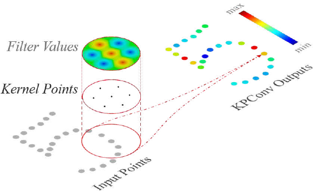 KPConv는 그림과 같이 기존 이미지 convolution과 유사하게 적용됩니다. 기존 2D image와 같이 각 point(이미지에서는 pixel)가 $D_{in}$개의 feature channel이 있을 때 $D_{out}$개의 kernel이 적용되어 $D_{out}$개의 feature channel이 생성됩니다.