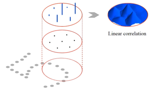 이를 이해하기 쉽게 2D로 보면 각각의 kernel point는 파란 기둥 크기의 각각의 weight를 가지고 각 kernel point들 사이에 linear correlation 하게 weight값이 계산되어 kernel 내의 모든 영역에서 weight가 계산됩니다.