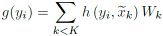 convolution kernel function $g$와 correlation 함수 $h$는 다음과 같습니다. $h$는 $\tilde{x}_k$와 $y_i$의 correlation으로 서로 가까울수록 높은 값을 가지게 됩니다.