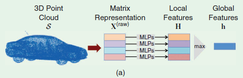Feature channel 수를 $D$라고 했을 때, 직관적으로 생각하면 MLP는 $D$개의 대표적인 geometric feature를 찾고 이러한 feature가 각 3D point 주위에 나타나는지를 확인합니다. (여기서는 이와 같이 설명했는데 조금 다르게 이 단계에서 각 3D point 주위를 확인할 수는 없고 나중에 max pooling을 통해 global feature만을 얻습니다. MLP는 $D$개의 function을 찾고 각 point마다의 함숫값이 계산됩니다. PointNet의 Figure 19. 에서 보는 것처럼 각각의 함숫값에 해당하는 point 위치가 생기며 max pooling을 통해 최댓값만 남으며 이 정보가 종합됩니다. 이 정보의 종합으로 point가 없는 부분은 잘라나가며 point의 전체적인 형상을 학습한다고 주장하였습니다)