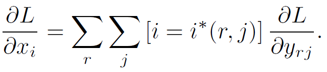Fast R-CNN은 모든 layer를 학습을 통해 업데이트한다고 하였으니 ROI pooling 이전의 input에 대해서도 계산이 가능해야 합니다. $x_i$가 RoI pooling layer에 입력된 $i$번째 activation input이라고 하고, $y_{rj}$가 $r$번째 RoI가 input으로 들어왔을 때 layer의 $j$번째 output이라고 했을 때 식은 다음과 같습니다.