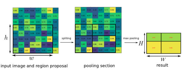 각각의 RoI에서 고정된 크기의 feature vector를 추출하기 위해서 RoI를 정해진 개수로 나누고 각 grid에 maxpooling을 수행합니다. 그림에서와 같이 $h=5, w=7$이고 $H, W=2$인 경우 4개의 grid가 생성되고 각 grid에는 해당 grid 내의 최댓값이 입력됩니다. 이는 SPPNet의 pyramid pooling을 하나의 pyramid level에 대해 수행하는 것과 동일합니다. 이렇게 하여 크기가 다른 RoI들에 대해서도 항상 같은 크기의 feature vector를 생성할 수 있습니다.